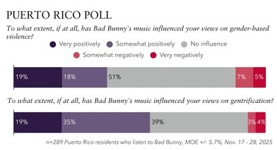 In a separate survey that examined the impact of Bad Bunny, a Puerto Rico native’s, music on two important social issues on the island, gentrification and gender-based violence, the results found that 85% of Puerto Rico residents said that the issue of gentrification, defined as the process where wealthier residents and businesses displace lower-income residents, was a “very serious” (70%) or “somewhat serious” (15%) problem. Additionally, 94% of residents surveyed said that gender-based violence was a “very serious” (85%) or “somewhat serious” problem (8%).