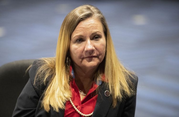 In this Feb. 2, 2021, photo, Virginia Sen. Amanda Chase and Republican gubernatorial candidate, speaks from her desk at the Science Museum of Virginia in Richmond, Va. The national Republican Party is at war with itself, struggling to reconcile a bitter divide