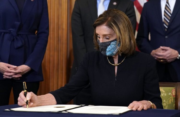 House Speaker Nancy Pelosi of Calif., signs the article of impeachment against President Donald Trump in an engrossment ceremony before transmission to the Senate for trial on Capitol Hill, in Washington, Wednesday, Jan. 13, 2021. (AP Photo/Alex Brandon) WASHINGTON (AP) —
