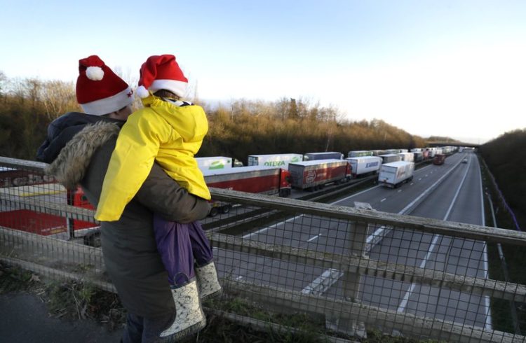 A mother and child look at the line of trucks parked up on the M20, part of Operation Stack in Ashford, Kent, England, Friday, Dec. 25, 2020. Thousands wait to resume their journey across The Channel after the borders with France reopened.