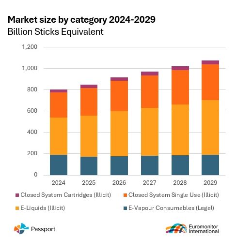 LONDON, United Kingdom – The illicit e-vapour market is valued at 47 million litres, equivalent to 605 billion sticks and accounts for three-quarters of total e-vapour volume globally, data analytics company Euromonitor International has revealed. According to Euromonitor International’s World Market for Nicotine 2025 report, the rise