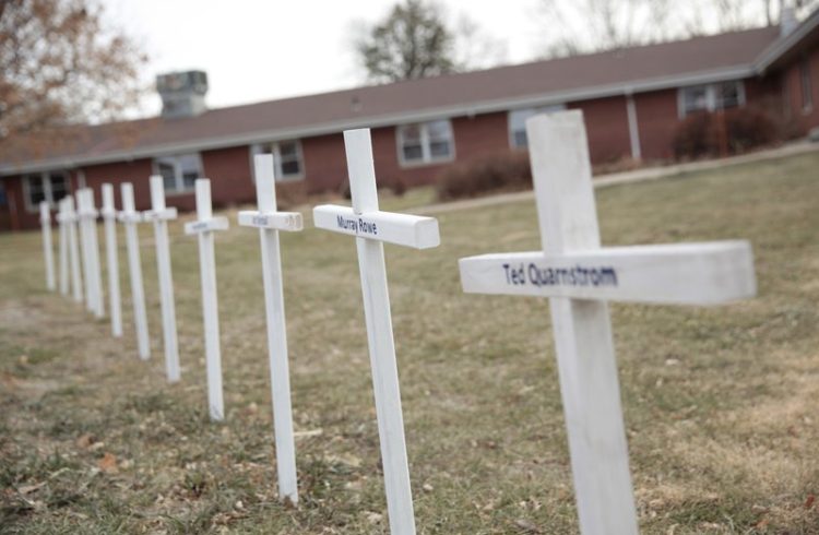 White crosses on the lawn of Good Samaritan Society nursing home Dec. 8, 2020, in Canton, S.D., commemorate residents who have died in recent weeks of the coronavirus. (AP Photo/Stephen Groves) CANTON, S.D. (AP) — The Nativity stable at Canton Lutheran