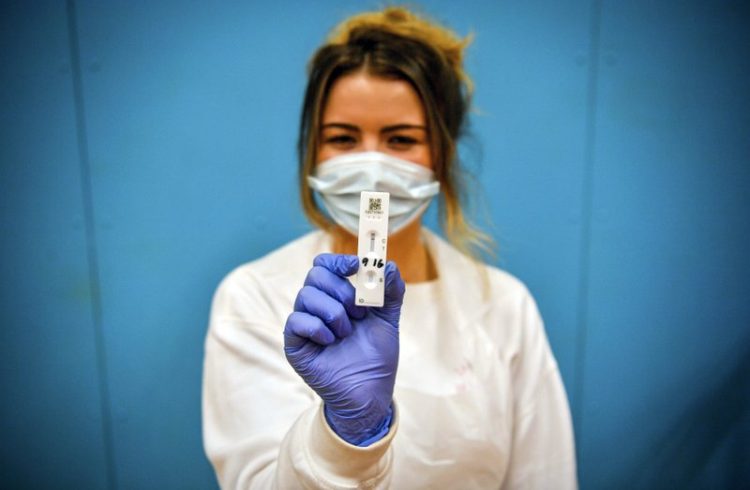 A member of staff displays a lateral flow immunoassay diagnostic device which shows the presence of SARS-CoV-2, before it is used on the public, at Rhydycar leisure centre in Merthyr Tydfil, Wales, Saturday, Nov. 21, 2020, where mass coronavirus testing begins following
